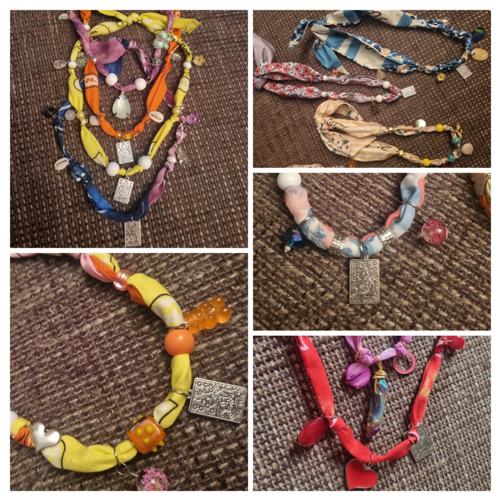 Kleurrijke bedelketting van reepjes stof met daarop geregen kralen met daar tussen bedeltjes.