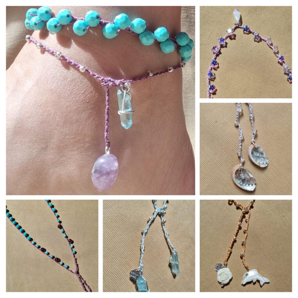 3-in-1 gehaakte ketting/armband/enkelbandje van zacht katoendraad met half edelsteen-en glas kralen met bedels aan de eindjes.