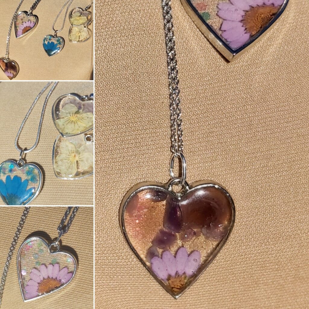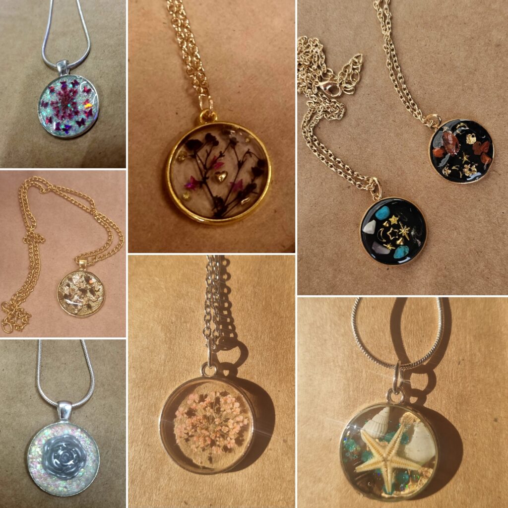 Met uv-hars gevulde dichte hanger met daarin glitters/bloemetjes/half edelsteentjes naar eigen idee.
